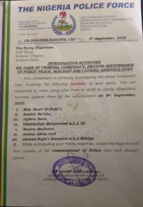 Deputy Commissioner of Police, DCP Uzainu Abdullahi said in an official letter to El-Rufai, dated 4th September 2025, requests him to appear at the Command on Monday September 8th 2025 along with the underlisted persons of interest over allegations of Criminal Conspiracy and other issues of concern in the State.
