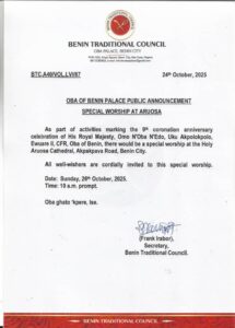 Omo N’ Oba N’ Edo, Uku Akpolokpolo, Ewuare II, Ewuare II, CFR, Oba of Benin will attend a special worship on Sunday October 26th at Holy Aruosa Cathedral also known as the Edo national church